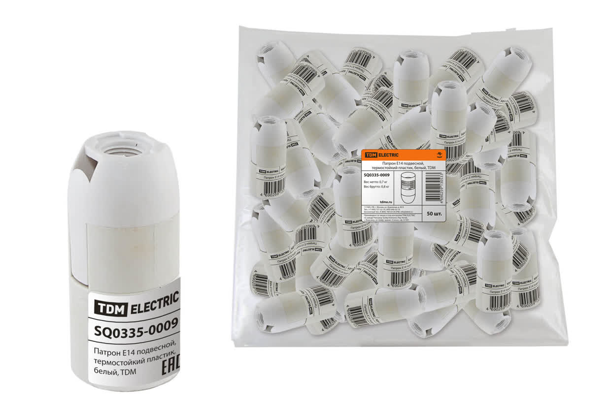Подвесной патрон Е14, белый TDM SQ0335-0009 используется в качестве комплектующего элемента для бытовых и промышленных светильников. Изделие фиксирует лампу и подсоединяет ее к электрической сети. Корпус патрона изготовлен из термостойкого пластика, который выдерживает температурные перепады от -100 °С до +260 °С. Также подходит для больших статических и динамических нагрузок, может использоваться при большом трении и излучении.